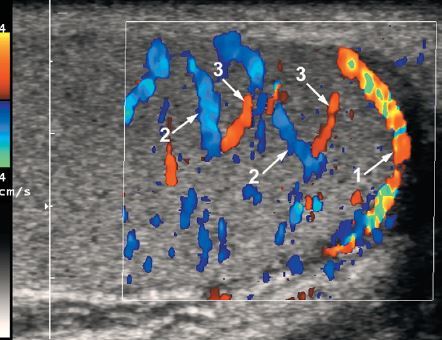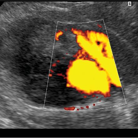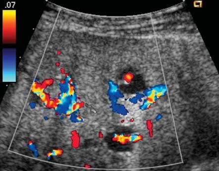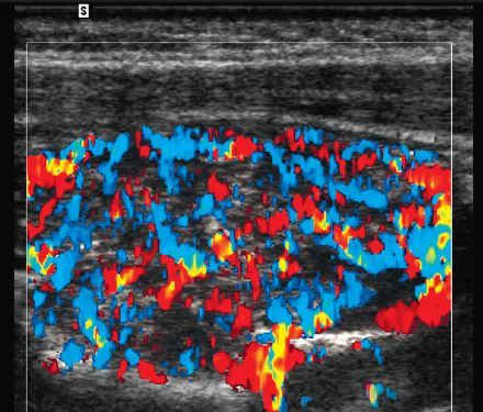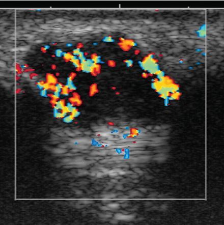 power Doppler view shows flow in the apparent