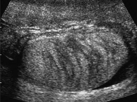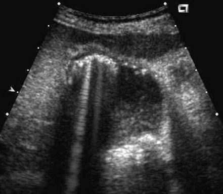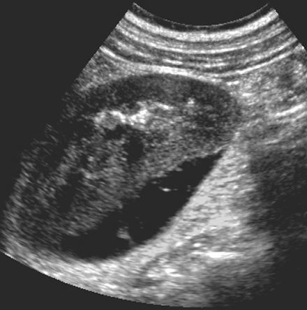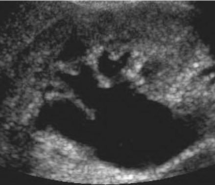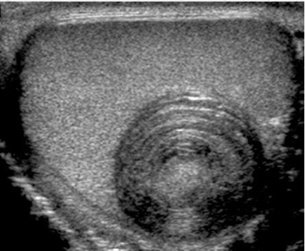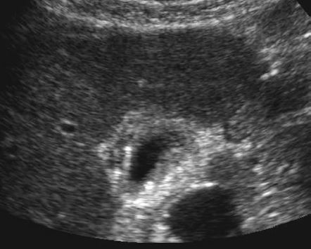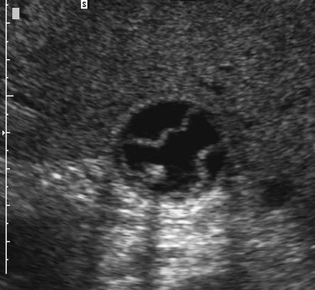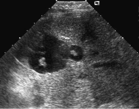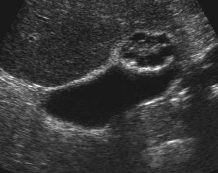 • hyperechoic rim with complete or partial rim of calcification