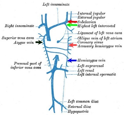 The accessory hemiazygous vein (orange arrow below) drains the posterior intercostal veins from 3-4 intercostal spaces between the left superior intercostal vein (green arrow below) and the uppermost branch of the hemiazygous vein (blue arrow below)