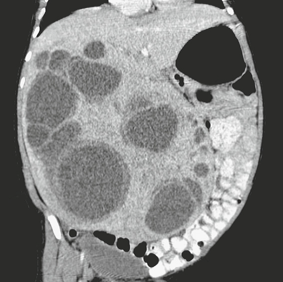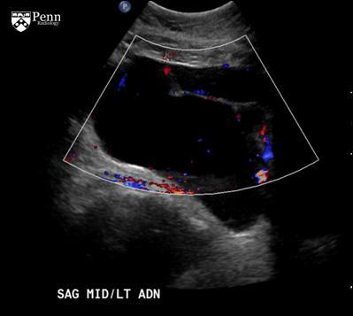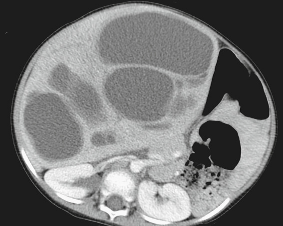Low-resistance flow may be detected in septations on Doppler flow ultrasonography due to small vessels traversing the mesothelial tissue in the cyst walls.
