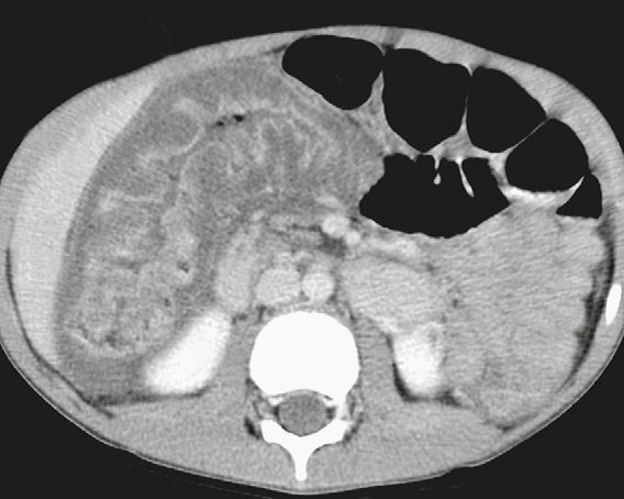 Fluid (arrowhead) between the pancreas and splenic vein,
