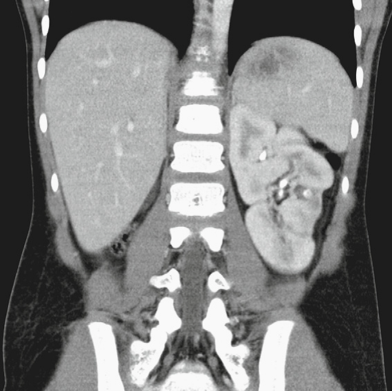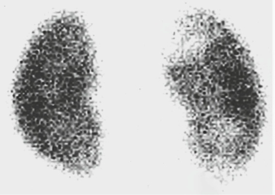 In pediatric patients in whom there is clinical difficulty in distinguishing an upper from a lower UTI, cortical scintigraphy using dimercaptosuccinic acid (DMSA) has been advocated as being the most sensitive test. In the case of pyelonephritis, this study demonstrates single or multiple areas of lack of renal uptake of the radiotracer. These areas tend to be triangular and peripheral.