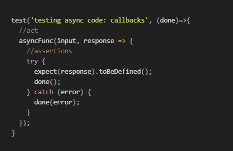 When testing asynchronous code that uses a callback to deliver a response, thetest()function argument should accept thedone()callback function as a parameter. Jest will wait fordone()to be called before marking a test as complete.