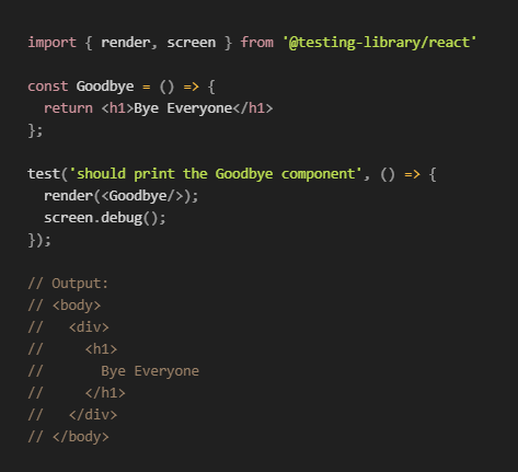The React Testing Library (RTL) provides arender()method for virtually rendering React components in the testing environment. Once rendered in this way, thescreen.debug()method can be used to view the virtually rendered DOM.