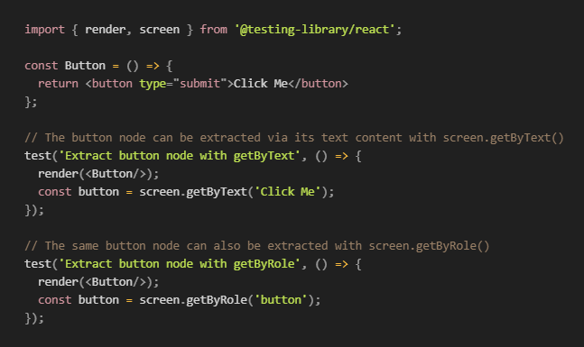Thescreen.getByX()methods (such asscreen.getByRole()andscreen.getByText()) return the matching DOM node for a query, or throw an error if no element is found.