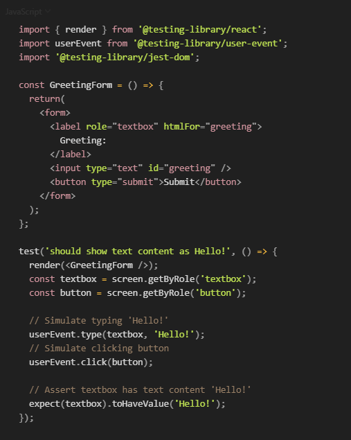 The@testing-library/user-eventlibrary is an extension of@testing-librarythat provides tools for simulating user interactions with the DOM. The provideduserEventobject contains methods that can be used to simulate clicks, typing, and much more.