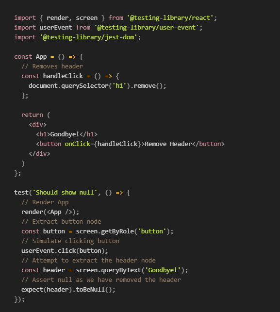 When using the React Testing Library to determine if an element is NOT present in the rendered DOM, thescreen.queryByXvariants (such asscreen.queryByRole()) should be used over theirscreen.getByXcounterparts.