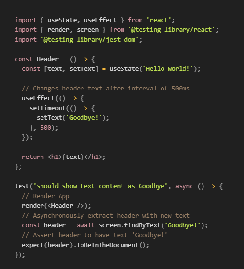 When using the React Testing Library to query the rendered DOM for an element that will appear as a result of an asynchronous action, thescreen.findByXvariants (such asscreen.findByRole()) should be used instead of the thescreen.getByXandscreen.queryByXvariants.
