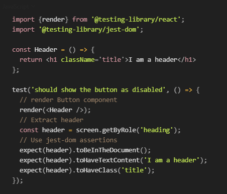 .toBeInTheDocument().toBeVisible().toHaveValue().toHaveStyle()It is common for this library to be used alongside the React Testing Library. The[jest-domdocumentation](https://github.com/testing-library/jest-dom)should be consulted to find the appropriate matcher method for your needs.
