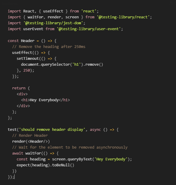 ThewaitFor()method in RTL is used to wait for asynchronousexpect()assertions to pass. It is often used in combination with the.queryByX()methods to determine if a DOM element disappears asynchronously.