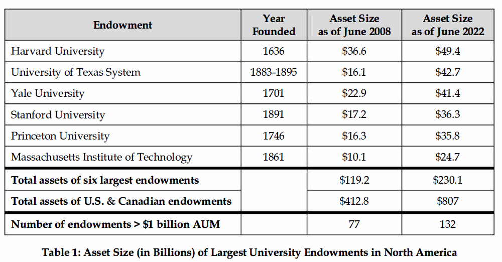 What are the 6 largest endowments in US & Canada and what are their sizes in 2008 and 2022