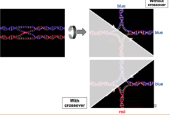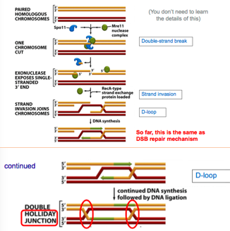 1) paired chromosomes are adjacent to each other 2)enzymes cause one of the double strands to break 3) exonuclease expose single stranded 3’ end 4) another enzyme causes the strand to invite the other double strand on the other chromosome 5) this produces a d loop 6)DNA synthesis occurs - forming a holiday junction 7) DNA ligase cuts either across the junction or diagonally down