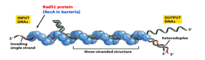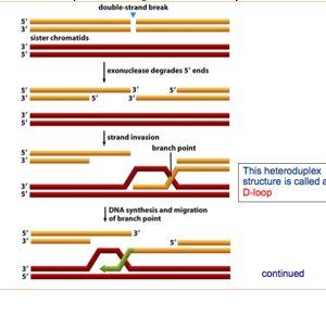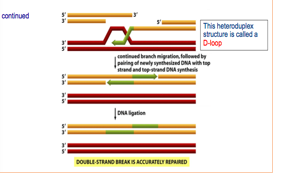 sister chromatid is positioned next to the double stranded break. There is a loss of nucleotides due to degradation, which removes the ‘sticky’ ends. When the ends have been processed, homologous recombination occurs and the damage is repaired accurately using inform from sister chromatid