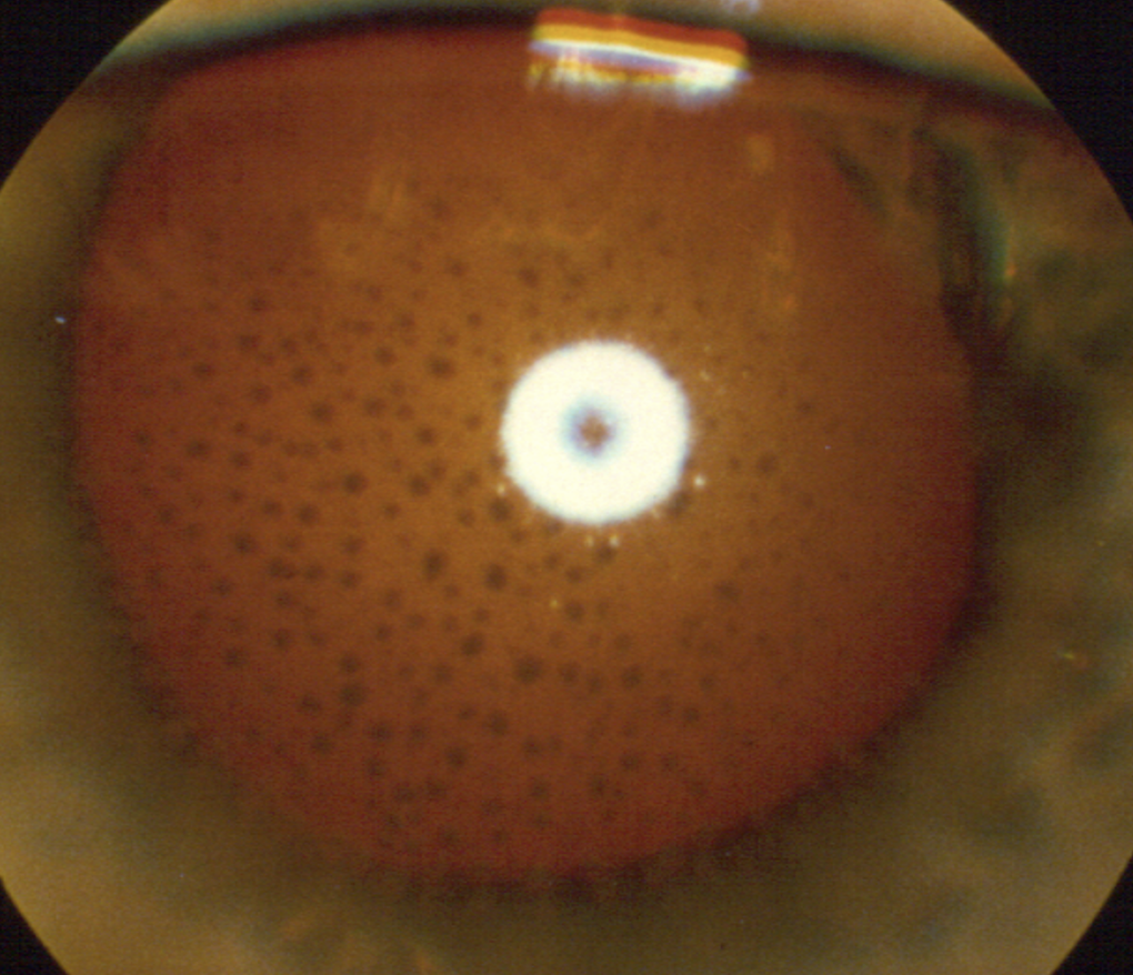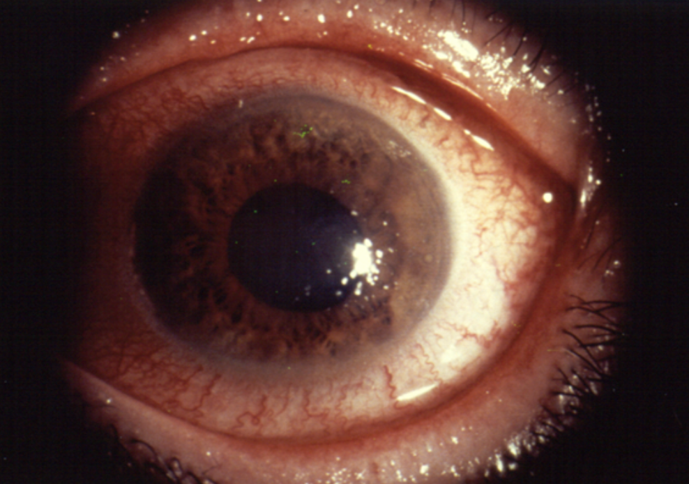 Large keratic percipitate: clumps of white cells are sticking to the endothelium of the cornea