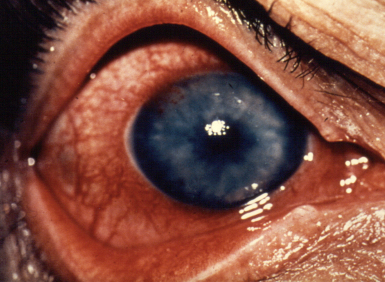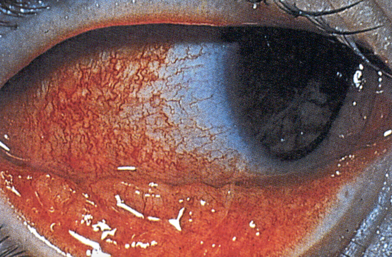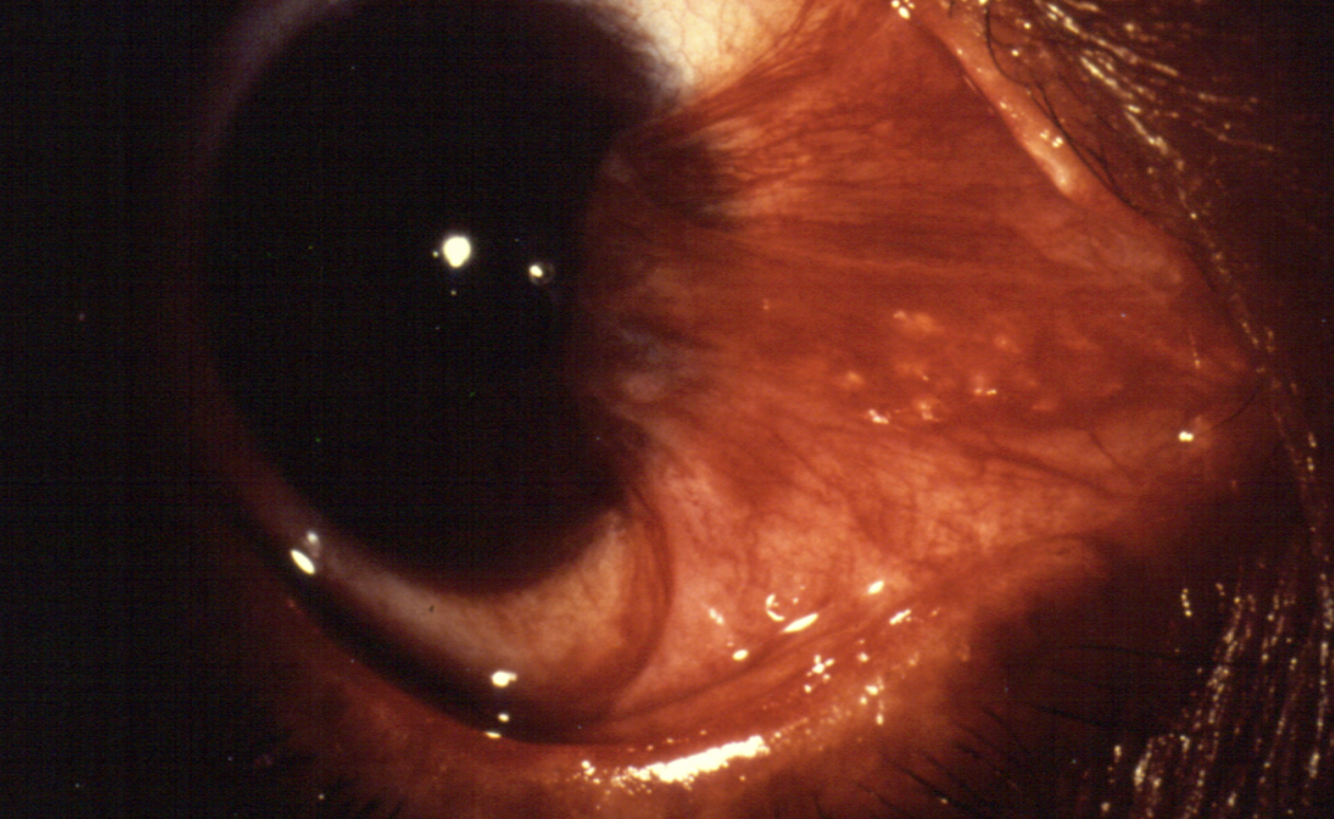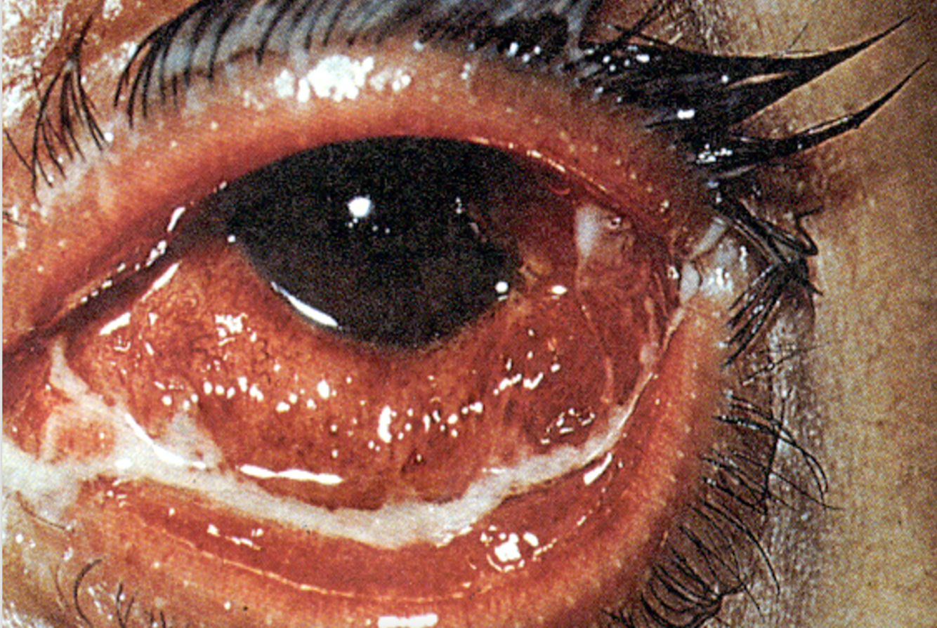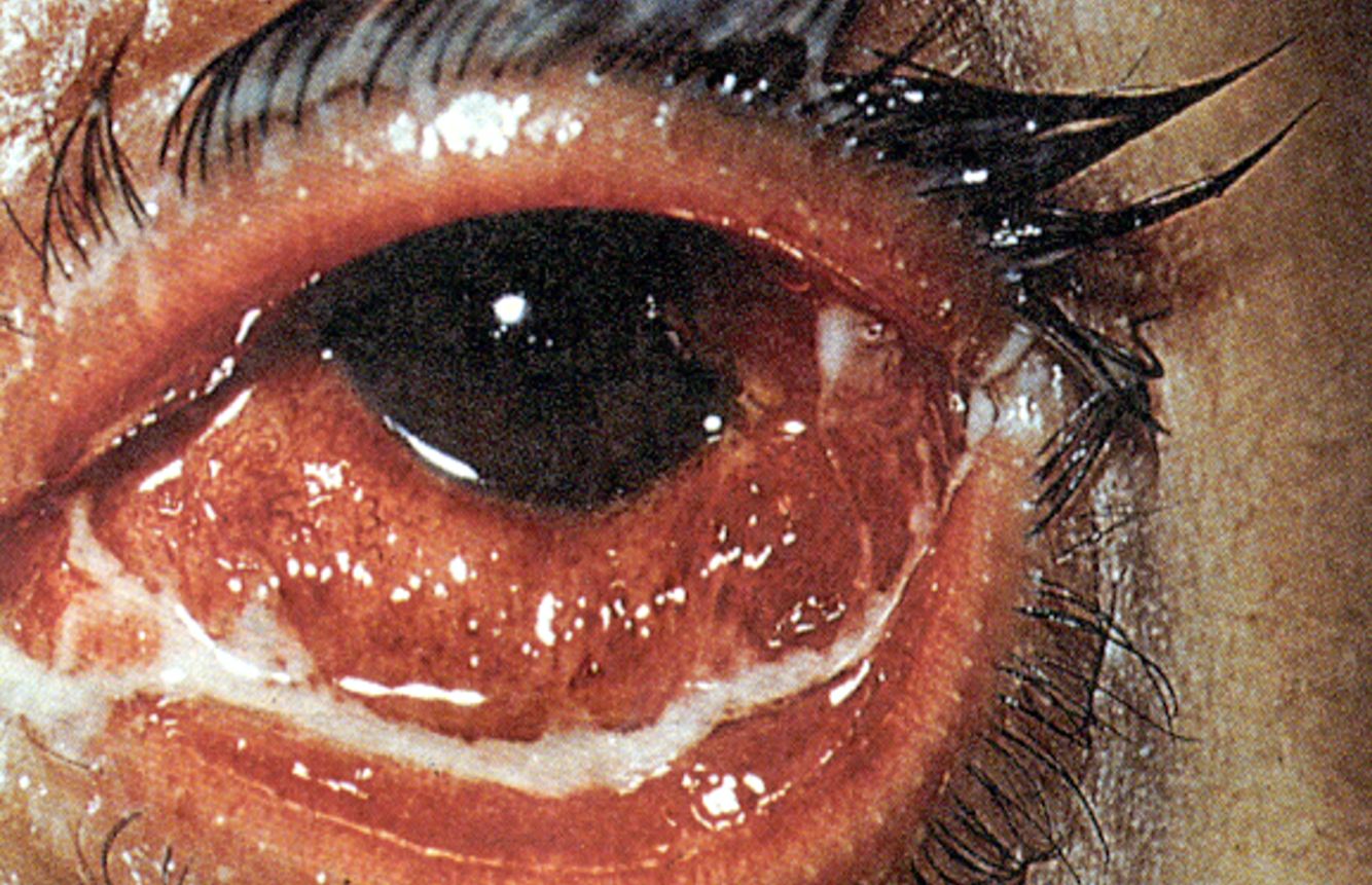 Notice creamy-white discharge and conjunctival hyperemia (common in many infections of conjunctiva)
