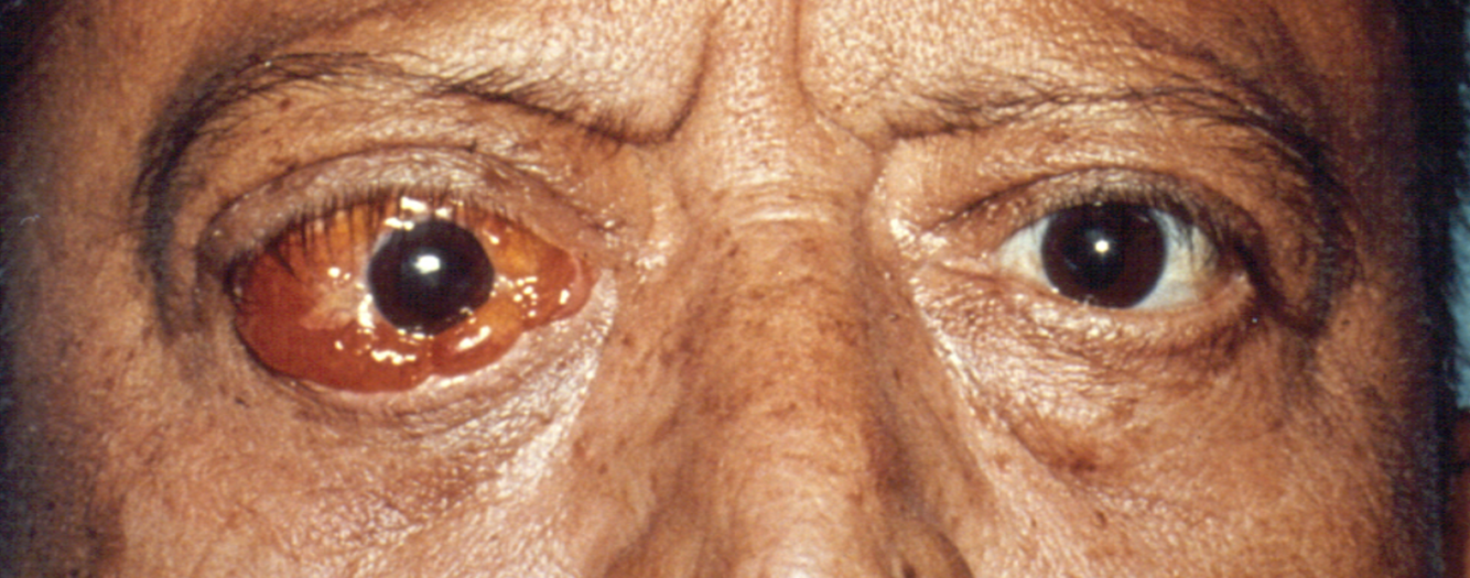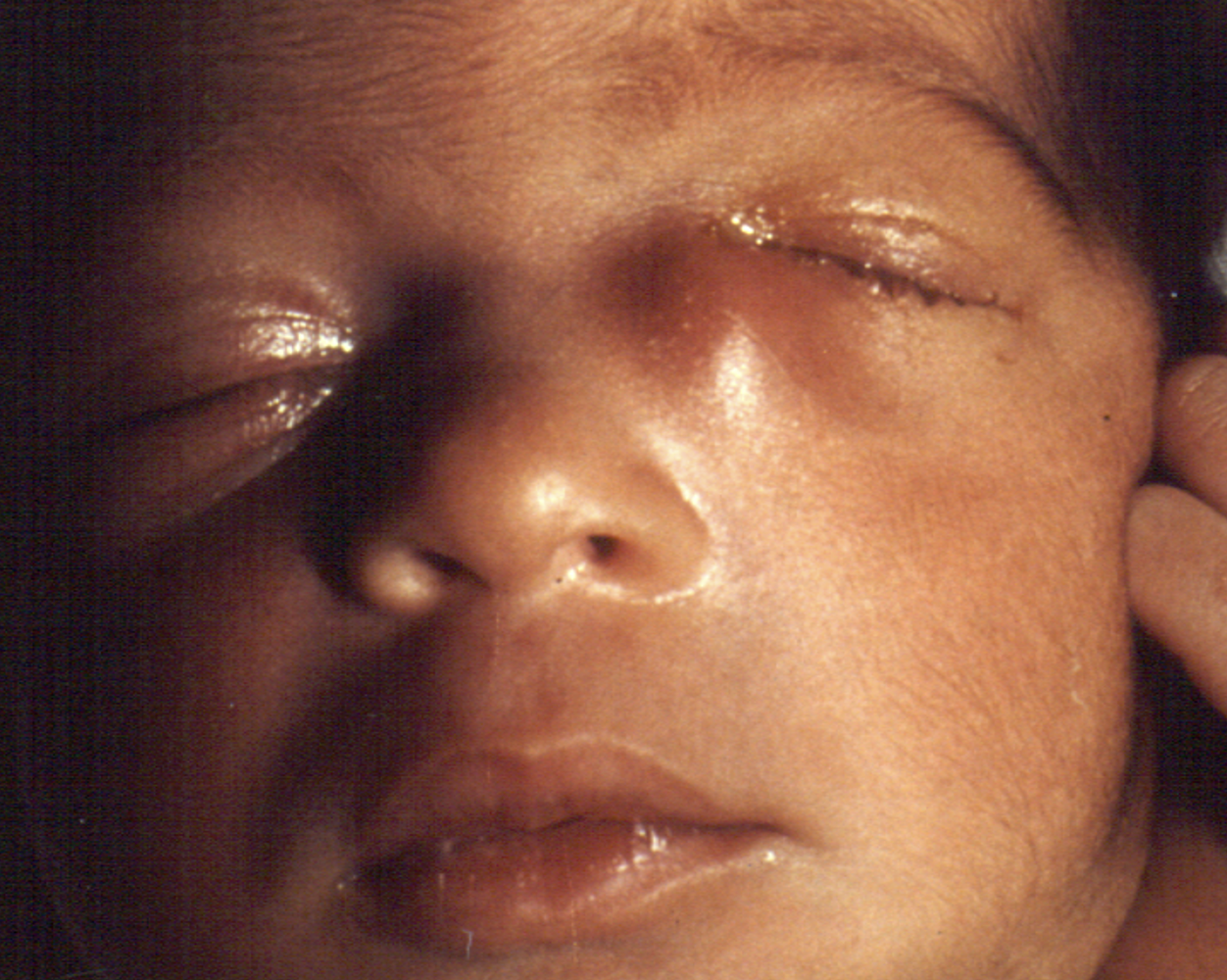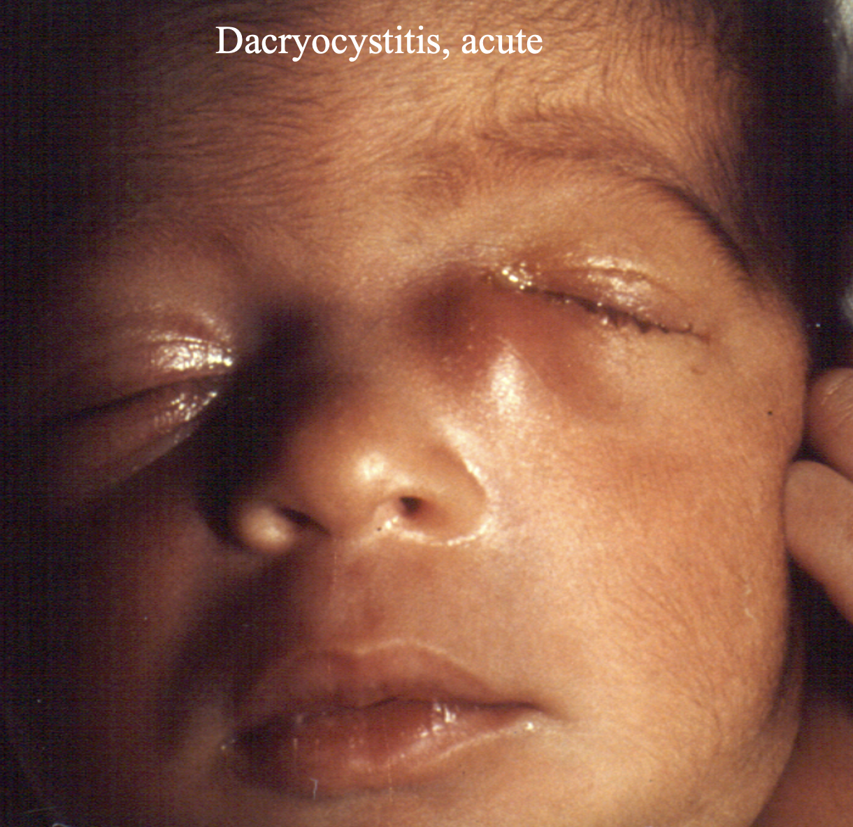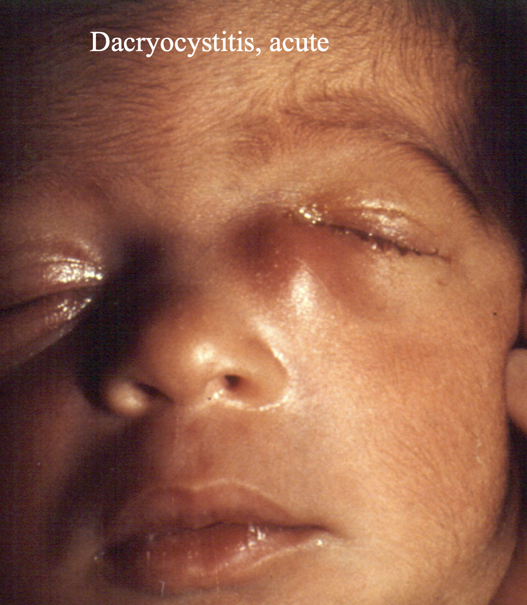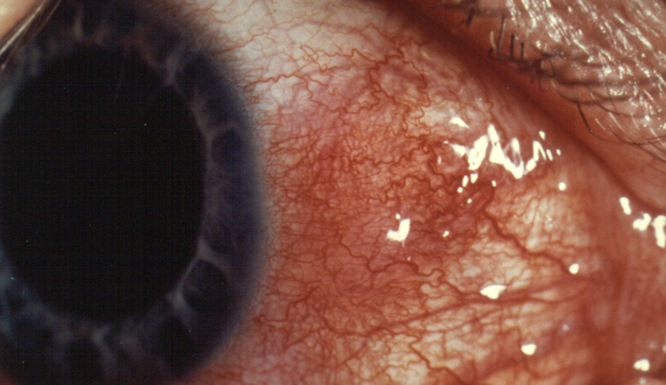 Notice creamy-white discharge and conjunctival hyperemia (common in many infections of conjunctiva)