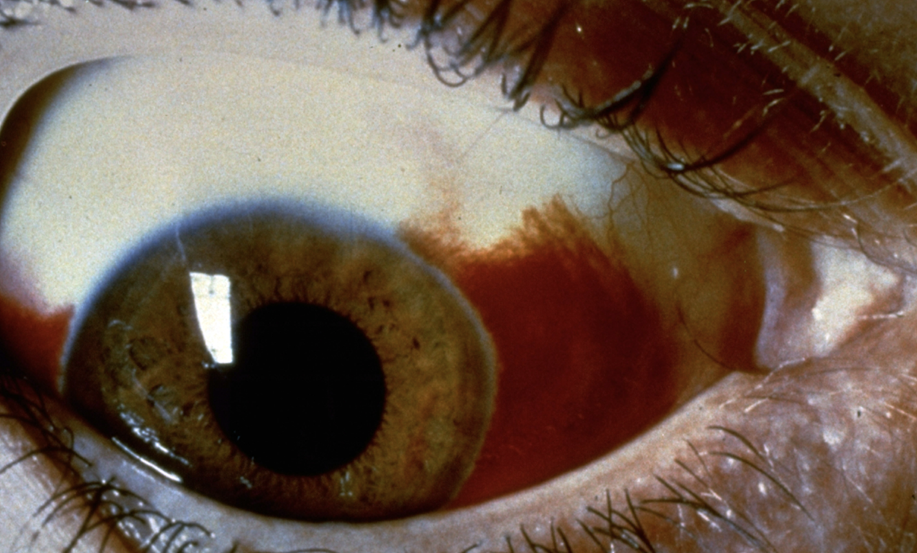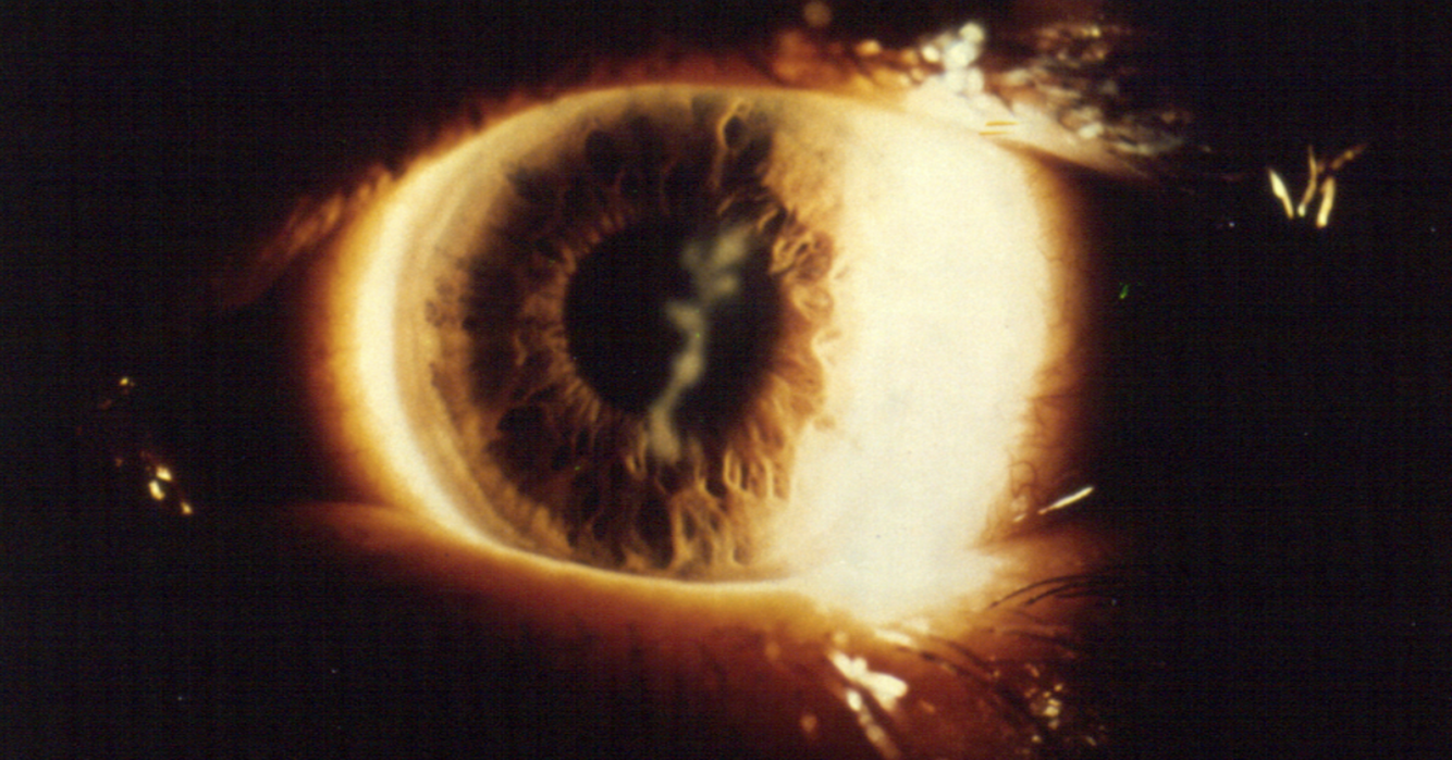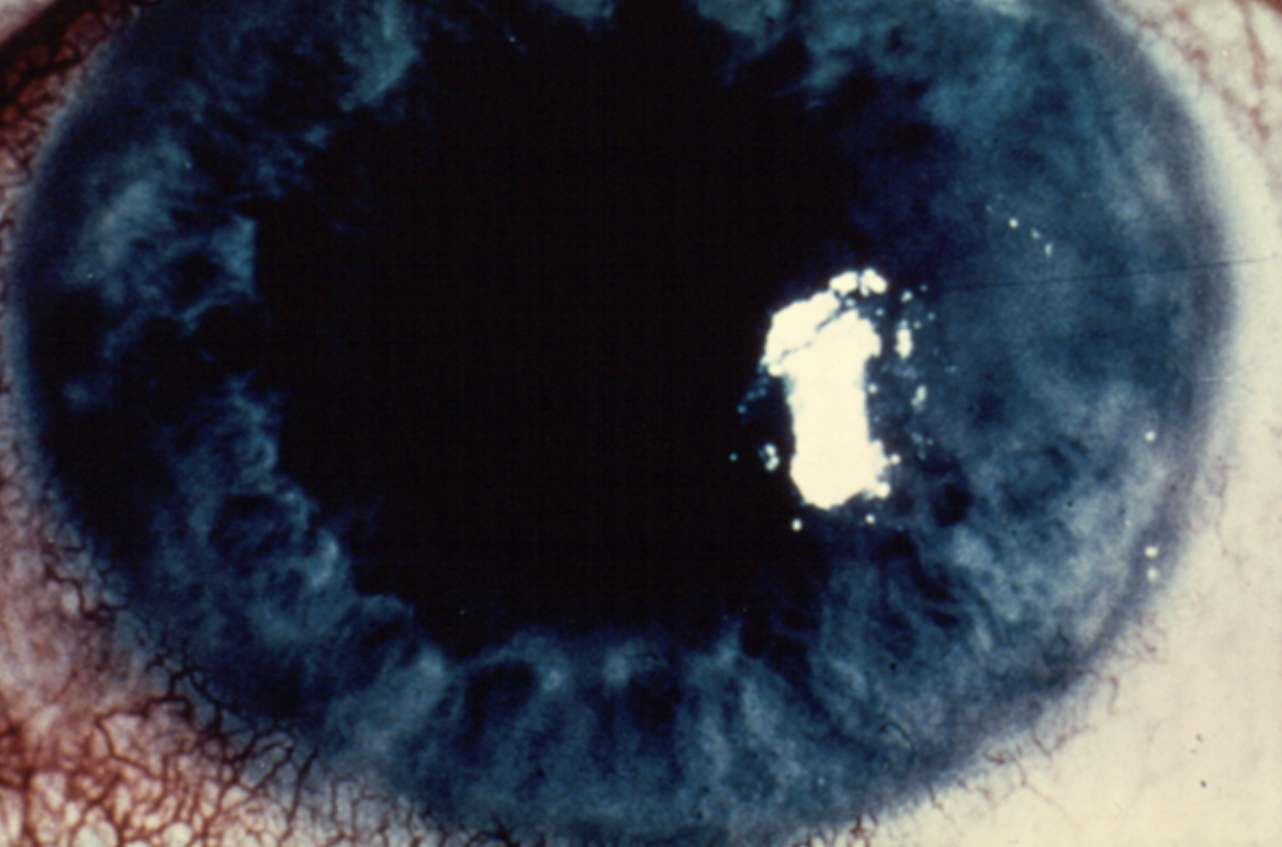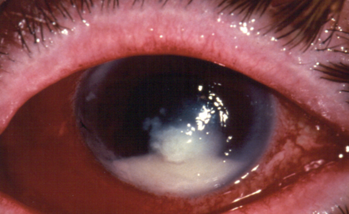 The eye shows a white corneal opacity w/ and irregular corneal reflex, along w/ that there is a prominent layer of purulent materal at the inferior aspect of the anterior chamber (hypopyon)
