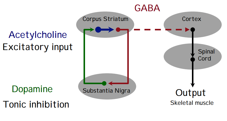 Three NTs: Ach (excitatory input), DA (tonic inhibition) and GABA