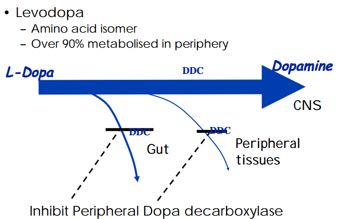 L-Dopa + Peripheral DDC inhibitor > prevents metabolism