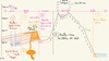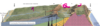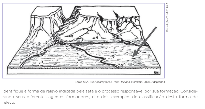 A seta indica uma planície, formada a partir do processo de deposição de sedimentos provenientes das regiões mais altas ao seu redor. A sedimentação das planícies pode ocorrer por meio da água de rios e do derretimento de gelerias, originando assim planícies fluviais e glaciais respectivamente.