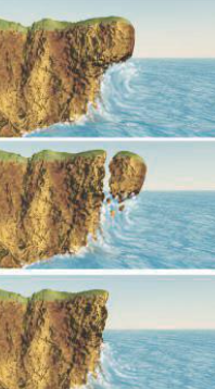 Intemperismo físico, por meio do choque mecânico da água do mar com a rocha.