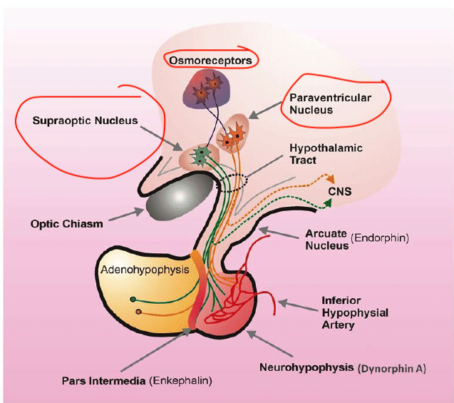 - supraoptic and paraventricular nuclei send axons down to capillaries within posterior pituitary