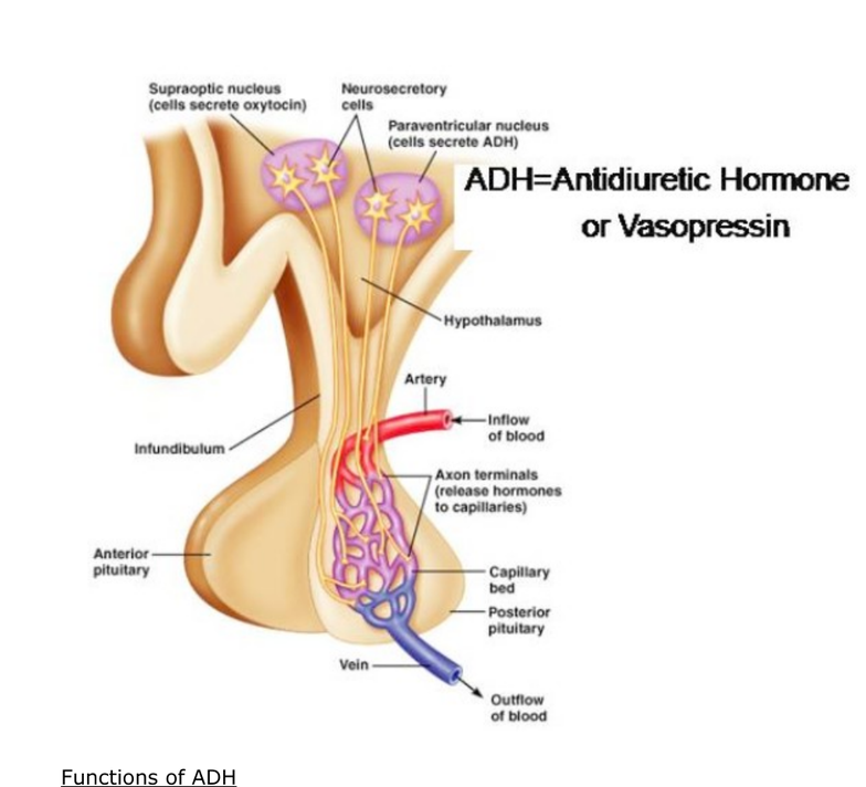 - axons secrete antidiuretic hormone (ADH) into pituitary capillaries