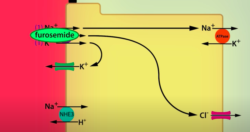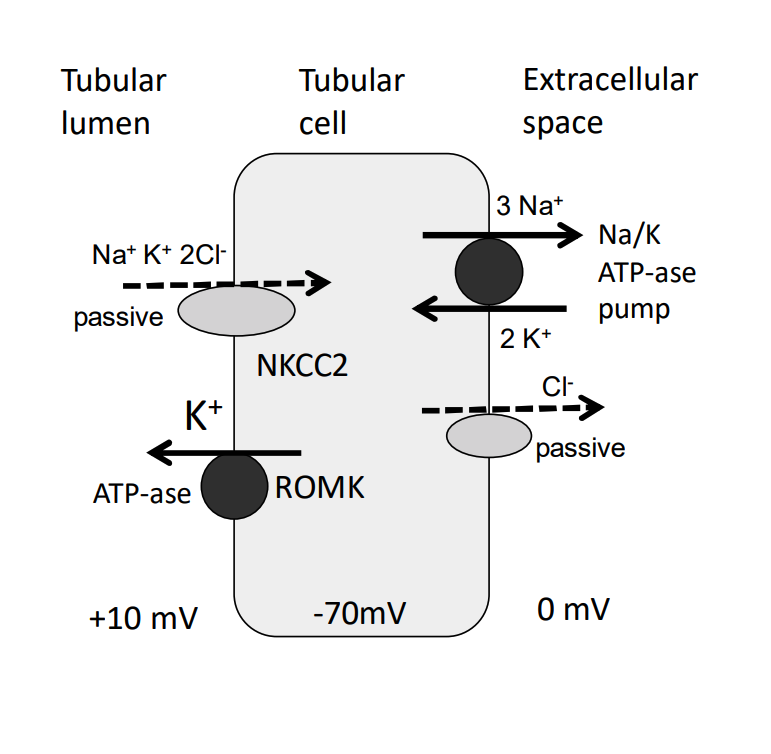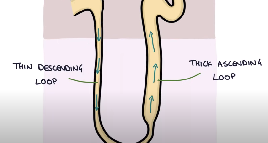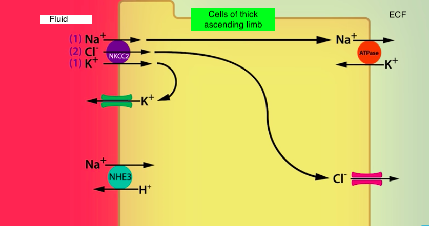 (- Fluid: proximal tubule –> thin descending loop of Henle –> thick part of the ascending limb)