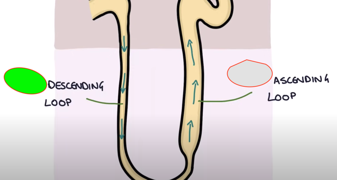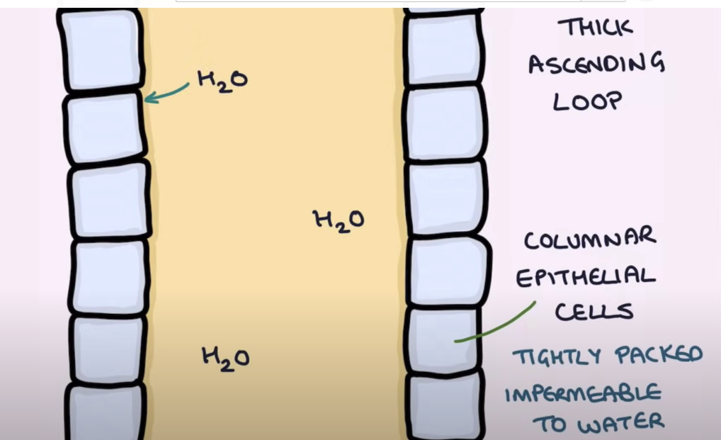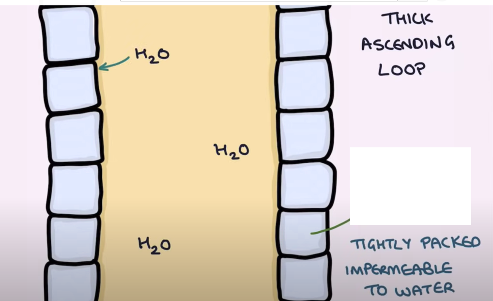 ascending loop of H: (opposite). impermbeable to water. ions move out