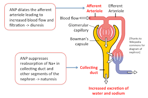 ANP decreases Na+ reabsorption in the distal tubule and collecting duct of the kidney.