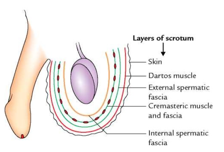 a continuation of scarpa’s fascia of the abdomina wall –> superficial fascia just underneath the skin. Dartos muscle is reponsible for the rugged appearance of scrotum