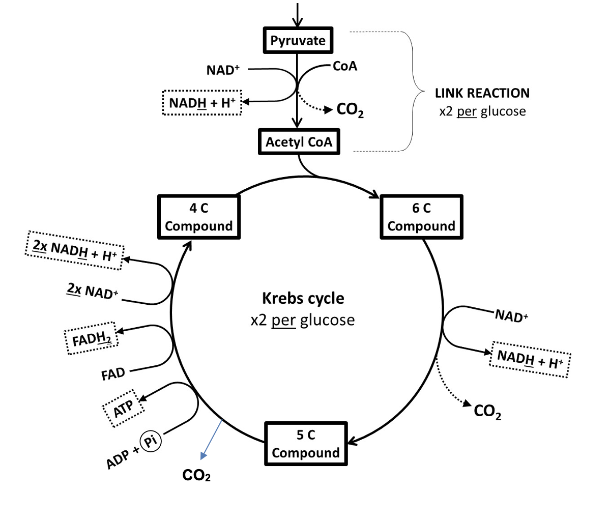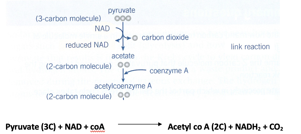 The Link reaction, Krebs cycle and electron transport chain stop as there is no Oxygen to act as the Final / terminal electron acceptor.