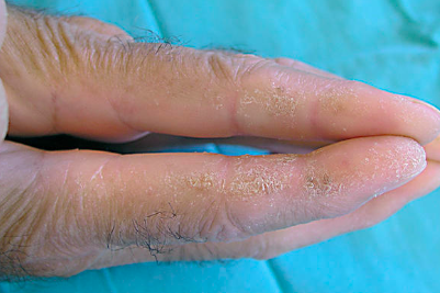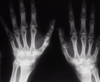 Hombre 77 años presenta aparición brusca de poliartritis en las manos, muñecas y hombros. Se despierta por las noches por dolor importante en ambas manos junto con disminución de la sensibilidad, “como si llevara guantes”, que mejora ”al sacudir las manos”. Movilidad limitada de ambos hombros y muñecas, hasta el punto de que le impiden incorporarse en la cama o de una silla. No muestra atrofia