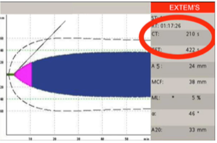 Prolonged clotting team = clotting factor deficency. Is 38 - 78 seconds. Give FFP