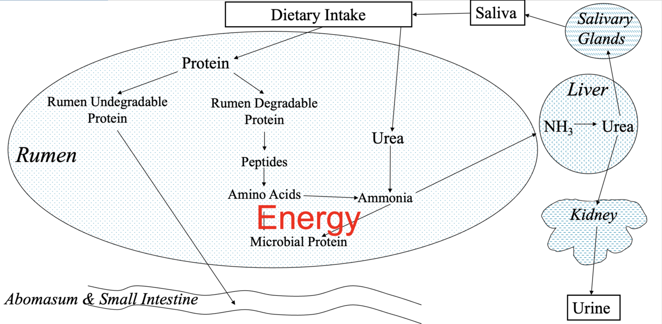 - urea enters the rumen through saliva or directly across rumen wall