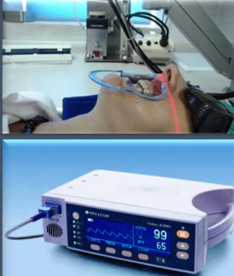 Pulse oximetry - measures oxygen concentration in blood and pulse rate, the transmission of light to the sensor requires there be no obstruction from restorations