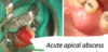 inflammatory reaction to pulpal infection and necrosis characterised by rapid onset, spontaneous pain, pain to biting pressure, percussion, palpation and varying degrees of mobility swelling intraorally (through pulp, mucosa or skin) and adjacent facial tissues will almost always present with some degree of swelling, pt will often be febrile and cervical and submd lymph nodes may be tender to palpation radiograph can exhibit anything from widened PDL space to PA RL
