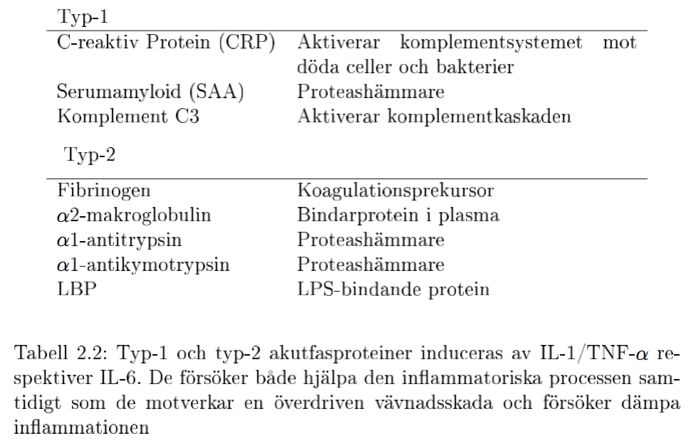Det sista steget är att akutfasproteiner skapas och utsöndras från le- vern och induceras också av IL-6, IL-1 och TNF-α. IL-1 och TNF-α induce- rar syntesen av typ-1 akutfasproteiner och IL-6 syntesen av typ-2. Målet med akutfasproteinerna är: att skydda kroppen från främmande organismer, be- gränsa vävnadsskador från en in ammation, öka koagulationsfaktorerna samt ge en antiin ammatorisk återkoppling. Tittar man på t.ex. CRP så promo- terar den en opsonisering av bakterier men även döda celler vilket skyddar kroppen, eller en stor mängd proteashämmare som förhindrar en överdriven vävnadsskada.
