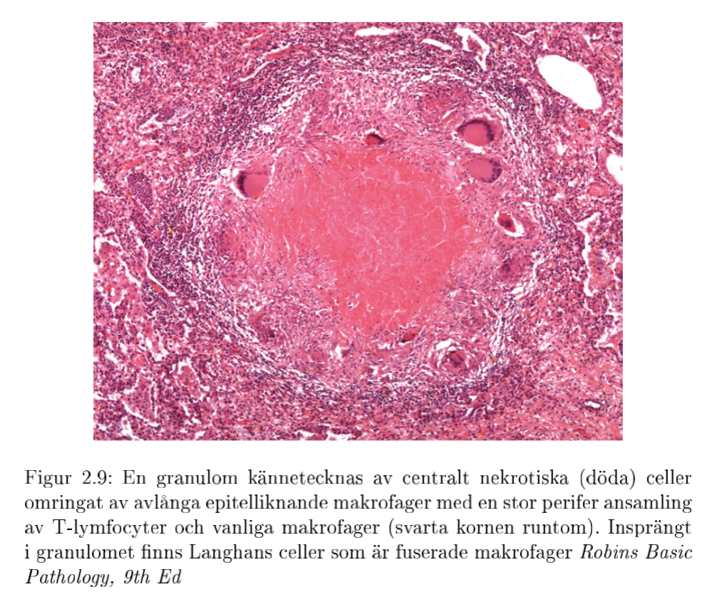 När kroppen vill eliminera något den inte vill ha sker det genom fagocy- tos av den oönskade entiteten, om det inte går att eliminera vad man nu har bestämmer sig makrofagerna för att gå ihop till stora enheter och försöka fagocytera den igen. Det är under fusionen av makrofager som en granulom börjar bildas. Granulomen kännetecknas av en stor hög med nekrotiserade epiteloida celler centralt, en enorm mängd T-lymfocyter och monocyter som ligger perifert samt epiteloida monocyter som är insprängda i gra- nulomet. Epiteloida celler (monocyter) är sekretoriska monocyter som liknar epi- telceller men är inte epitelceller, de har otydliga cellkonturer och är fyllda med granula. De erkärniga jättecellerna är epiteloida celler som gått ihop för att försöka bryta ned och om inte isolera den in ammatoriska agenten. En specialtyp av jättecell som är den vid granulom kallas även Langhans jätteceller, då ligger kärnorna i en hästsko-form.