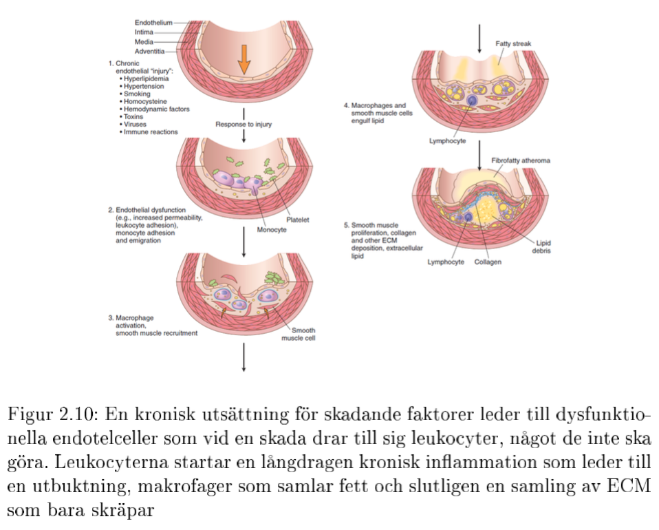 Det slutliga steget är en extracellulär ansamling av bros och fett som ett resultat av den kroniska in ammationen, om inga plack ramlar av kan ansamlingen av fett och kollagen leda till att kärllumen blir så liten att vi får en ischemi nedströms.