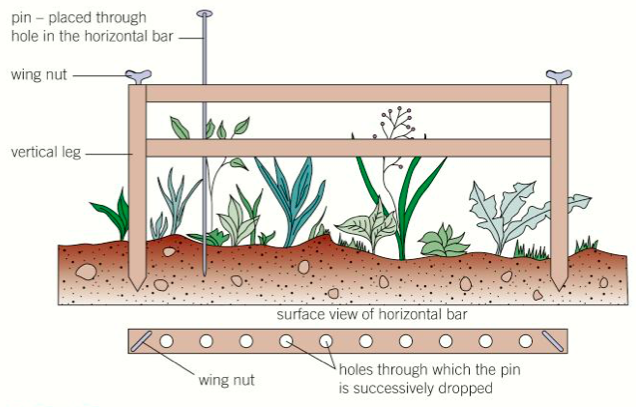 it consists of a frame containing a horizontal bar. At set interval along the bar, long pins can be pushed through the bar to reach the ground. Each species of plant the pin touches is recorded