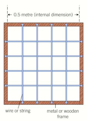 It consists of a square frame divided into a grid of equal sections. The type and number of species within each section of the quadrat is recorded