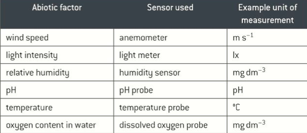 Name some examples of abiotic factors and the sensor used to detect it