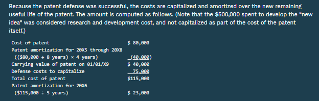The cost of a patent on a company’s books is the cost to file for the patent, and it is increased by any legal costs to successfully defend the patent, thus the $40,000 and the $50,000 for a total of $90,000. Development costs are expensed as incurred.