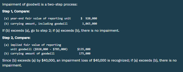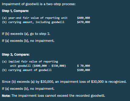 Determine whether the fair value of the reporting unit is less than the carrying amount and report an impairment loss on goodwill in the income statement. ## Footnote Goodwill is impaired when the carrying amount exceeds the goodwill's implied fair value. If the implied value of the goodwill has decreased below the carrying value, write the goodwill down and recognize a loss.