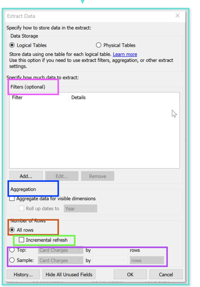 Explain the purpose of the five highlighted areas in the Extract Data options pane