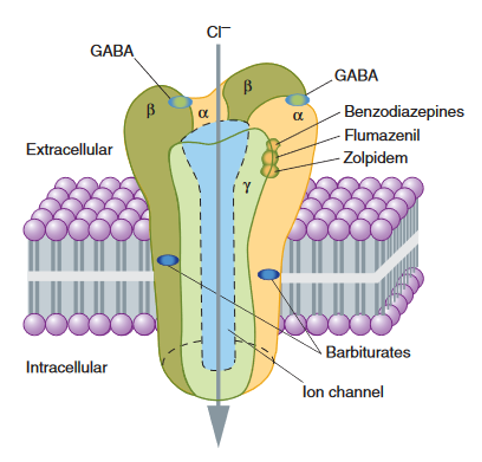 GABA-A: primary- induces sedative hypntoic state; Cl- channel