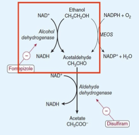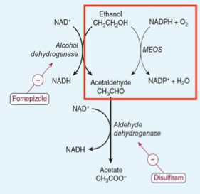 1) Ethanol–> Ethanol oxidizing system (MEOS) + NADHP= Acetaldehyde & NADP