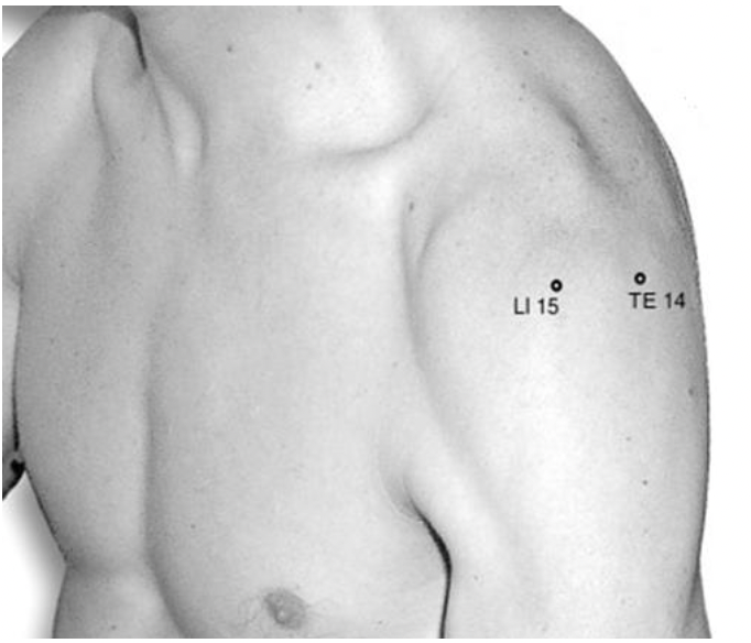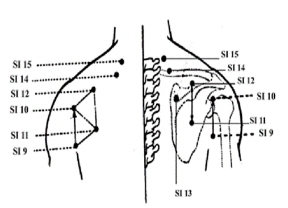 Midway on the line connecting the midpoint of the upper margin of the spine of the scapula (SI 12) and the inferior angle of the scapula. Alternatively, locate the point at the junction of the upper one third and lower two thirds on the line connecting the midpoint of the lower margin of the spine of the scapula and the inferior angle of the scapula.