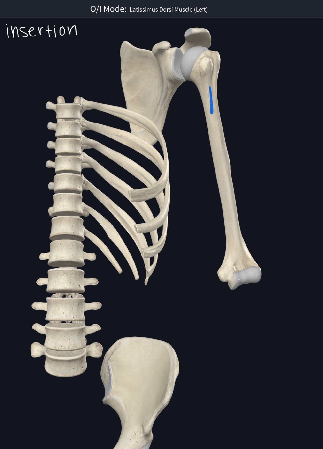 I – lateral to intertubercular groove of humerus